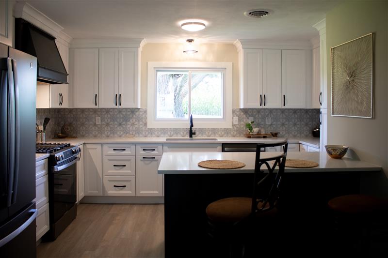 Sterling Woodworks completely flipped the flow of the kitchen, relocating the peninsula so the entry now opens gracefully near the refrigerator. To balance budget and resale goals, high-quality RTA (ready-to-assemble) cabinetry was selected in a neutral finish—delivering a polished, timeless look without the expense of full custom. A built-in microwave in the peninsula maximized counter space, while quartz countertops provided an elevated yet practical upgrade from laminate. By removing the intrusive soffit and carefully reworking the layout, the kitchen now feels open, functional, and inviting—ready to serve both everyday life and future resale value.
