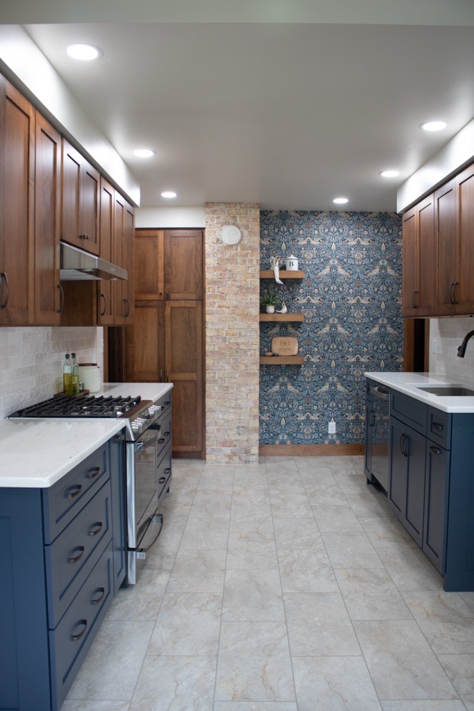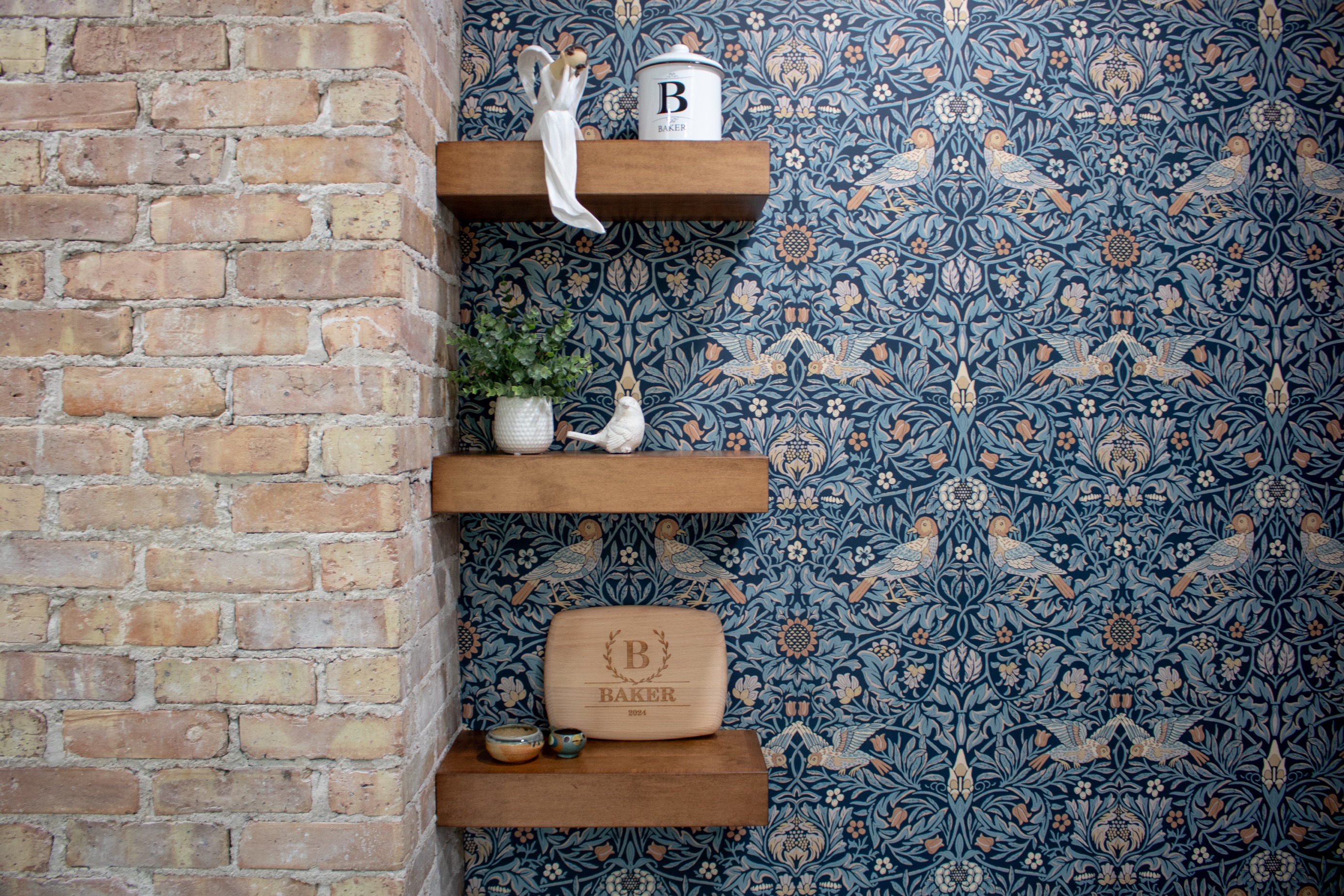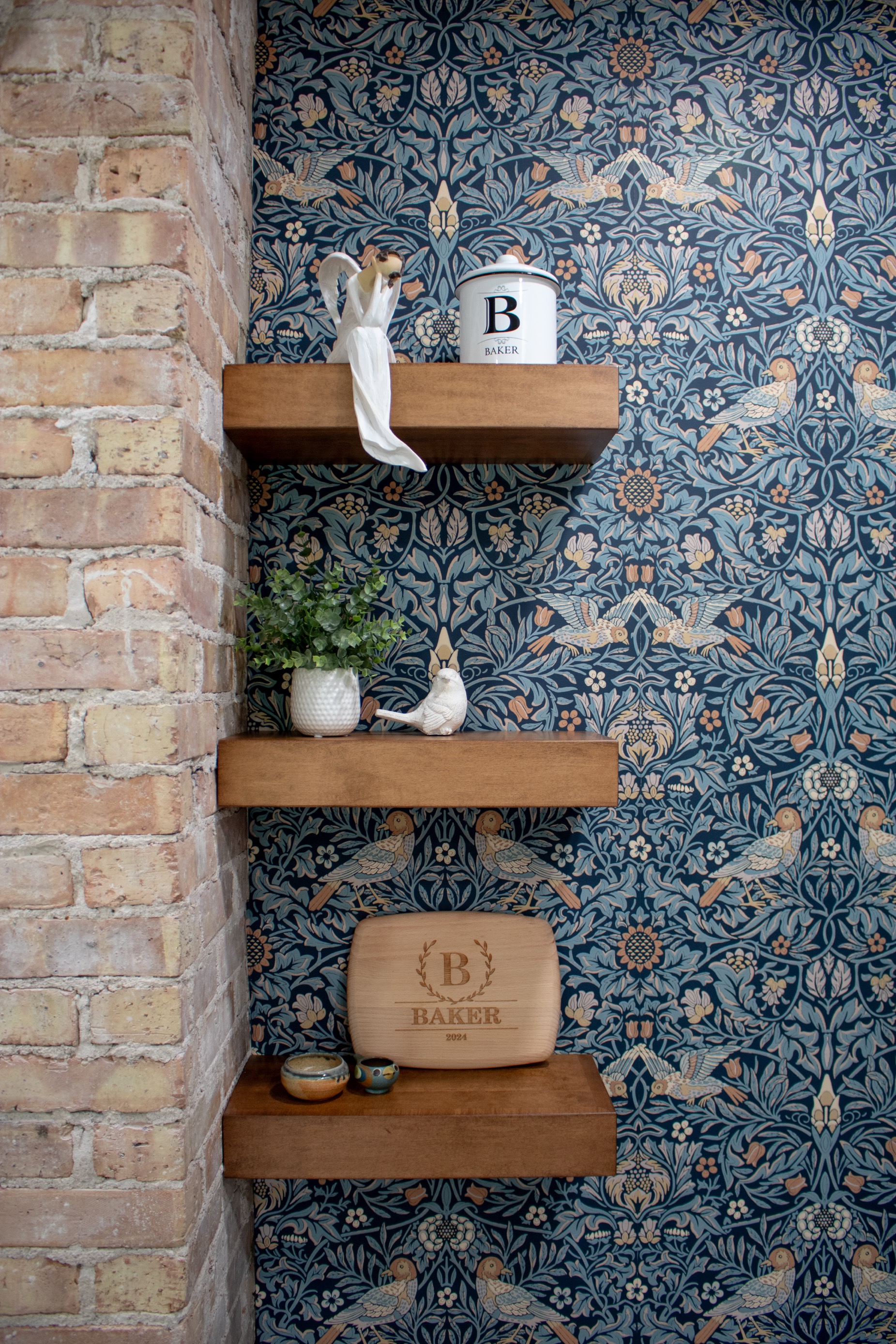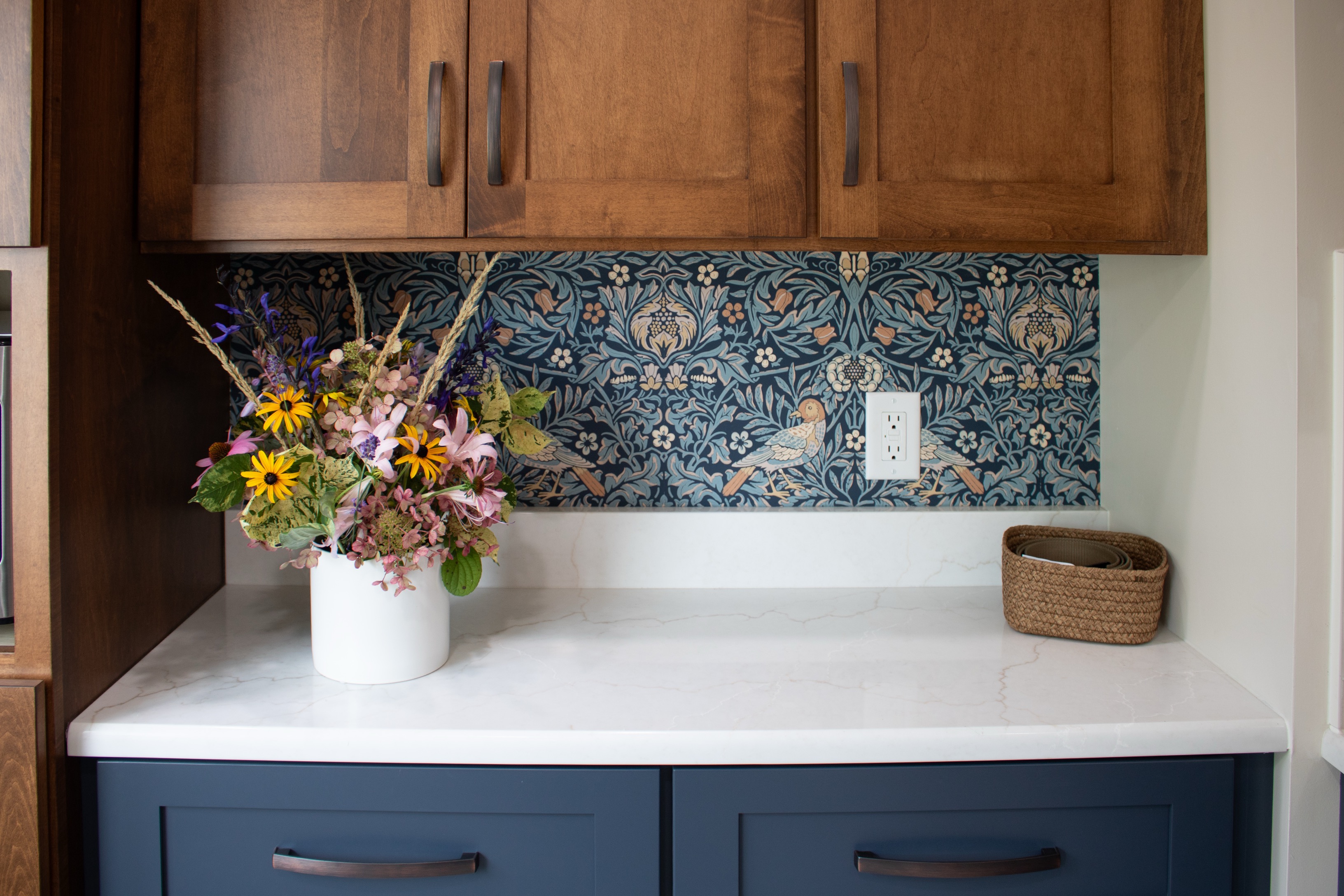 The Bakers selected stunning neutral quartz countertops, paired with Sterling Woodworks’ signature Hale Navy lower cabinets and warm wood-stained uppers—a combination that feels both classic and fresh. A Morris & Co. bird-themed wallpaper tied it all together, echoing the warmth of the newly exposed brick chimney and giving the kitchen a one-of-a-kind personality. The wallpaper, a Sterling Woodworks in-house designer favorite, created the perfect “birds of a feather” finishing touch.