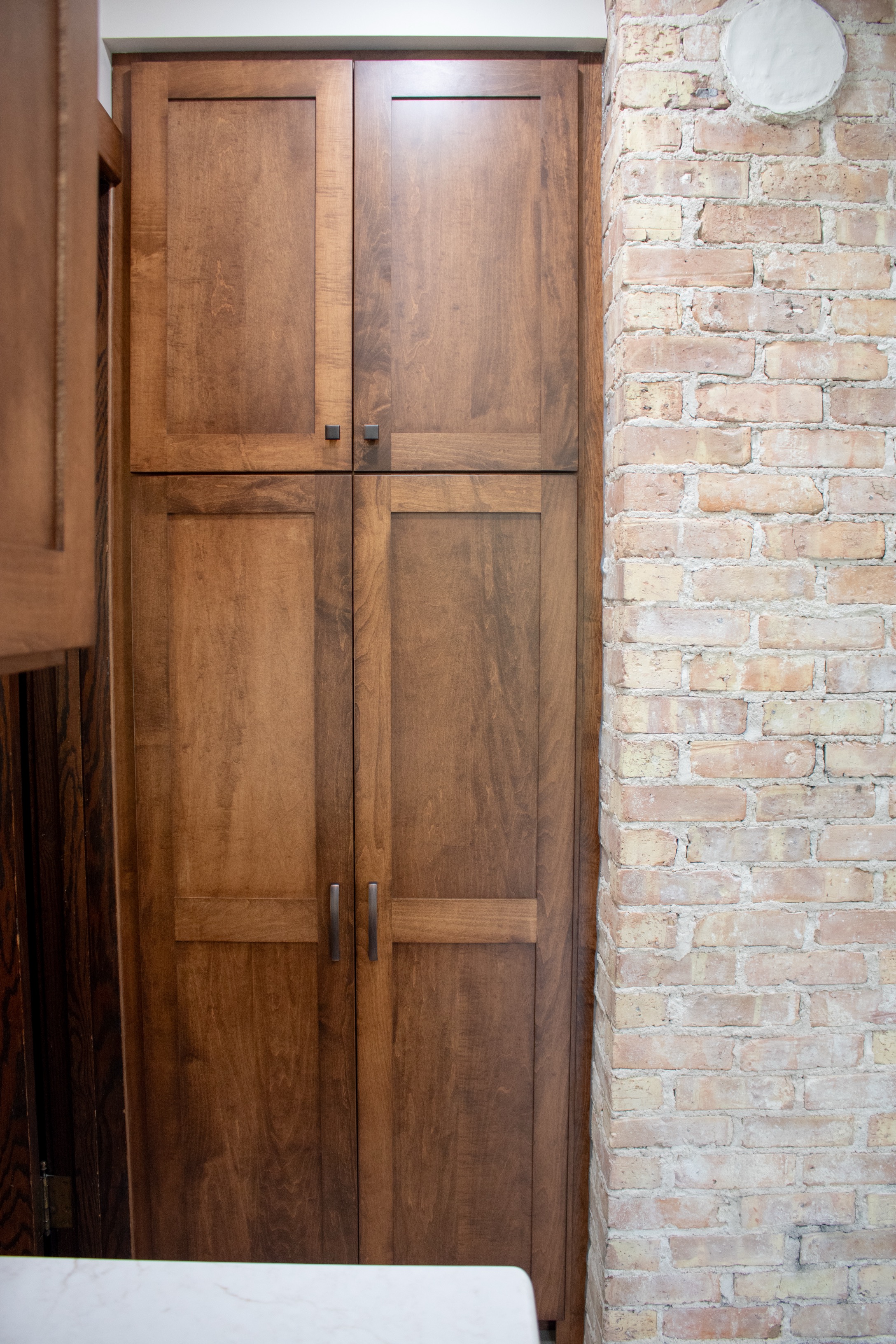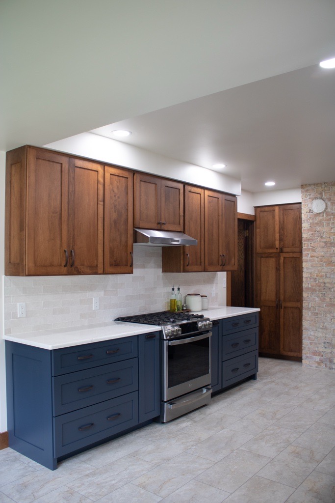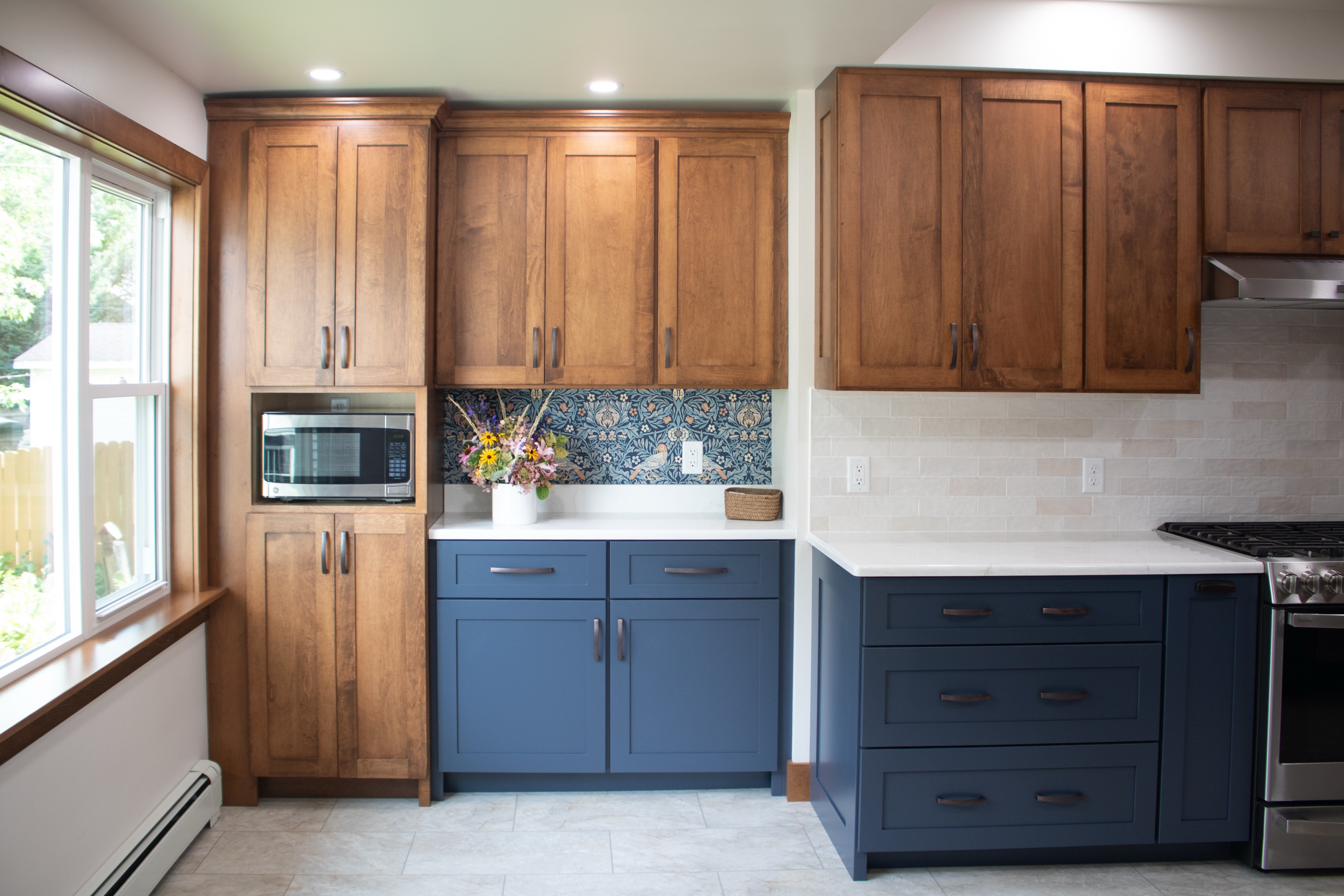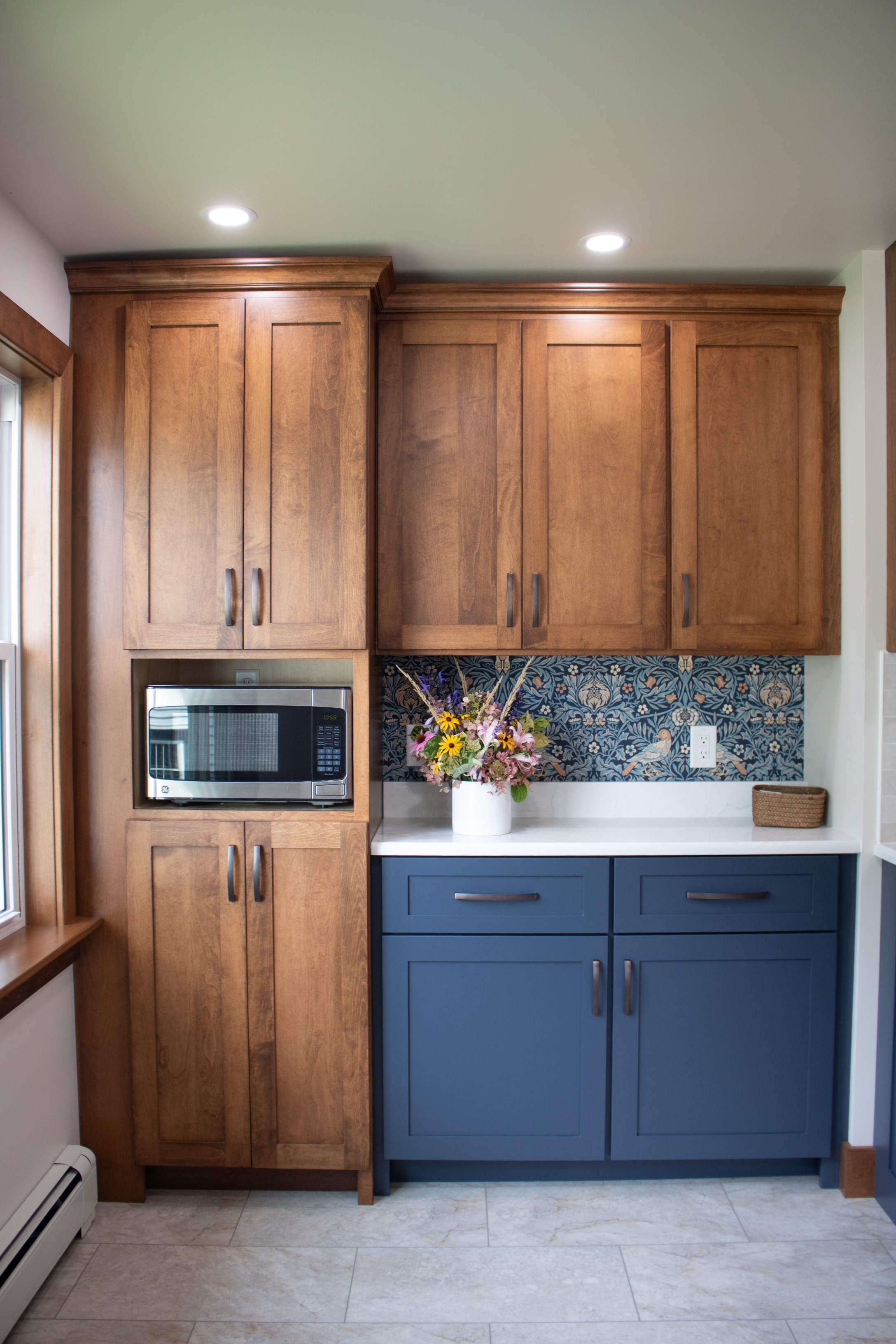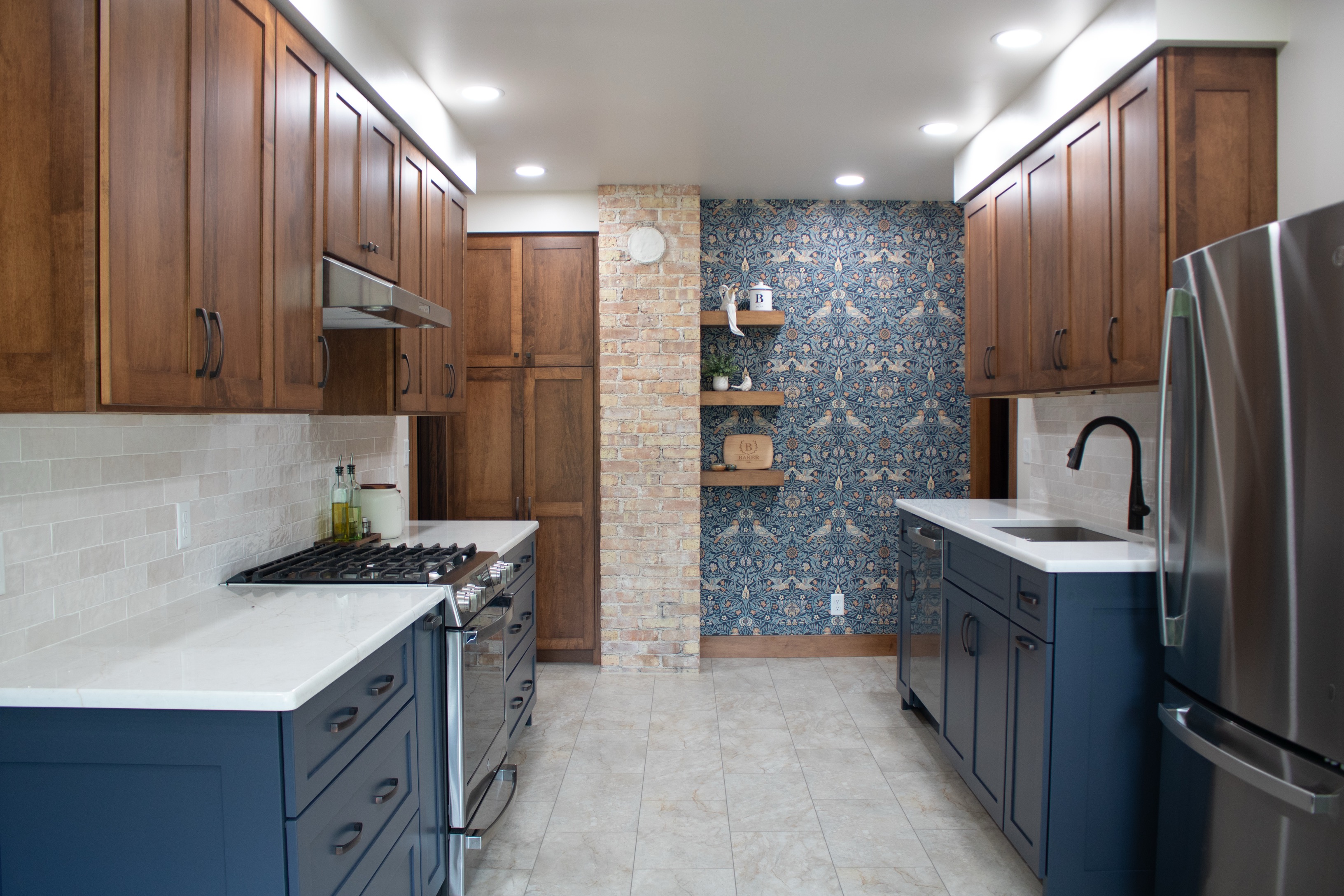 The Bakers selected stunning neutral quartz countertops, paired with Sterling Woodworks’ signature Hale Navy lower cabinets and warm wood-stained uppers—a combination that feels both classic and fresh. A Morris & Co. bird-themed wallpaper tied it all together, echoing the warmth of the newly exposed brick chimney and giving the kitchen a one-of-a-kind personality. The wallpaper, a Sterling Woodworks in-house designer favorite, created the perfect “birds of a feather” finishing touch.
