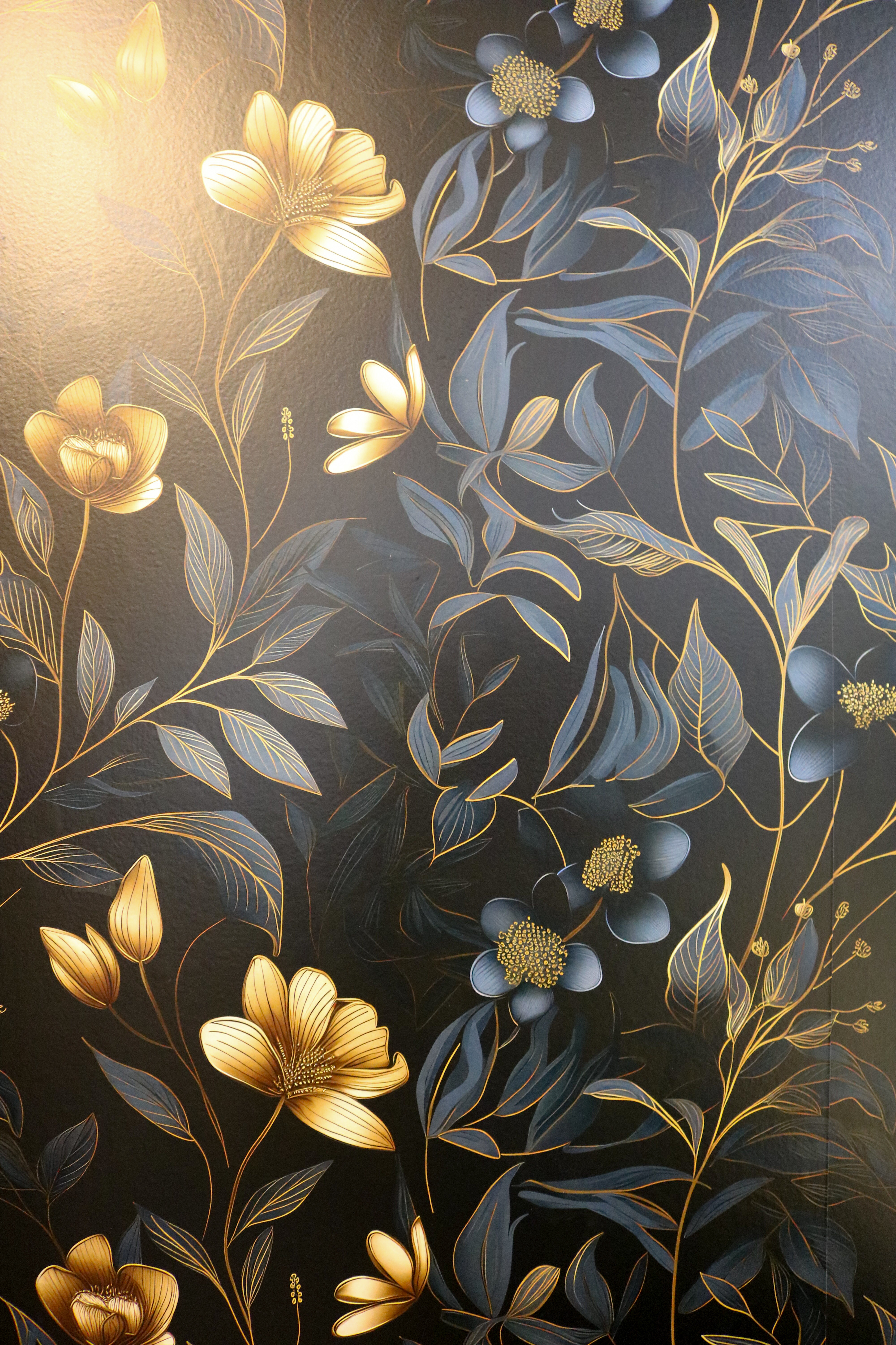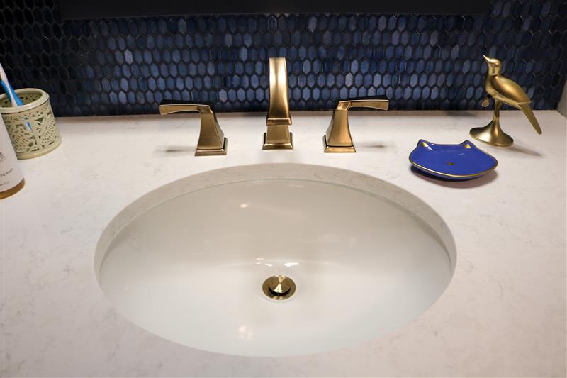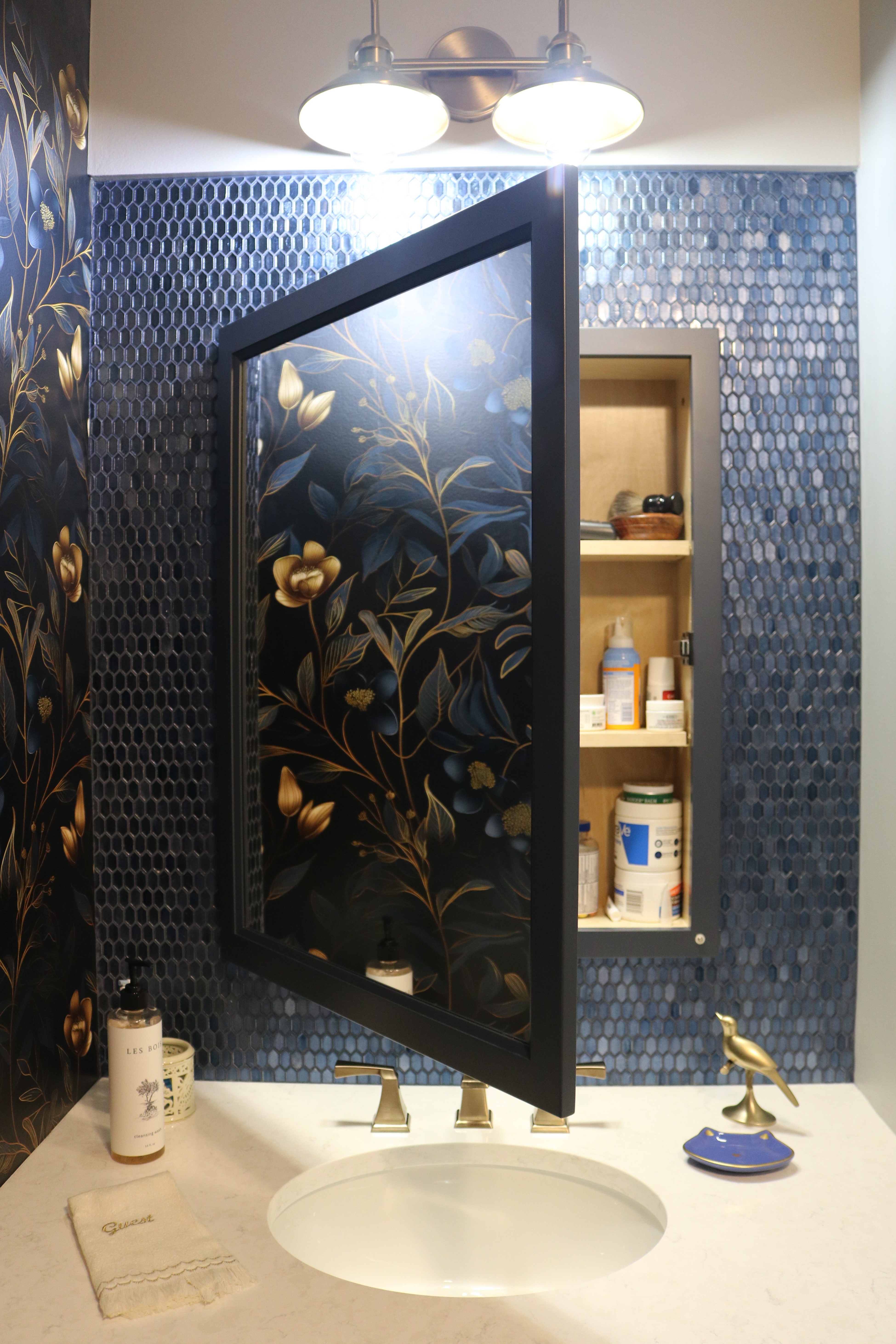 In the bathroom, a Hale Navy–inspired vanity grounded the space with depth and contrast, while a light quartz countertop and antique gold fixtures carried the warmth and elegance of the kitchen through the rest of the home. The design preserved the existing built-in medicine cabinet, blending old and new in perfect proportion.