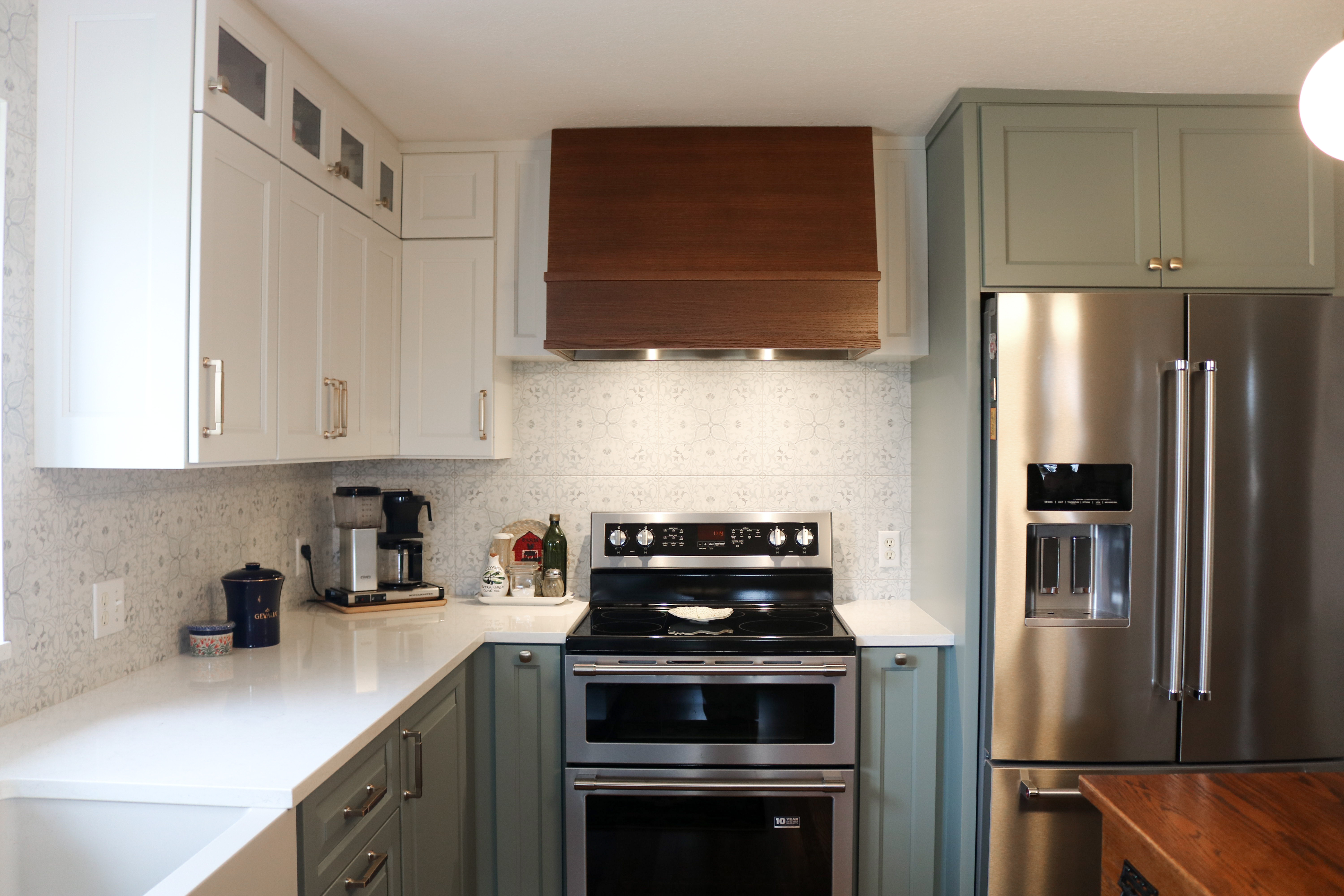 Sterling Woodworks reimagined both spaces to bring unity and craftsmanship throughout the home. In the kitchen, we introduced Acacia Haze painted base cabinetry with white glass-door uppers extending to the ceiling, creating light, balance, and a sense of timelessness. A custom wood hood, matched to the repurposed antique seed bin island and vintage hutch, tied the new design to the home’s story. Since the soffit couldn’t be removed, faux cabinets were added above the refrigerator for a built-in look.